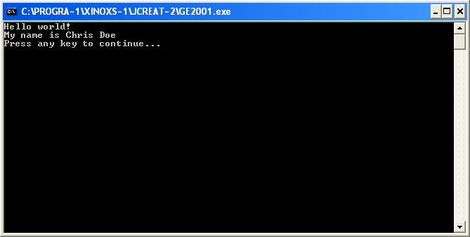 This will pop up a black window, as shown below. This window shows the output produced by the execution of the program. For this program, it shows the two lines printed via the two System.out.println lines in the program code.